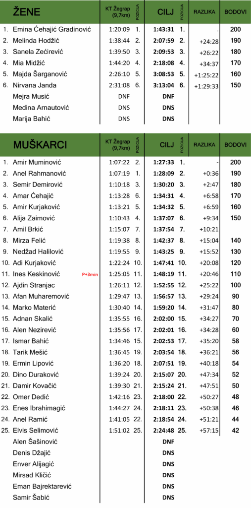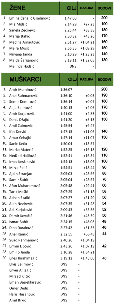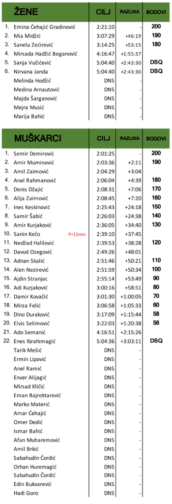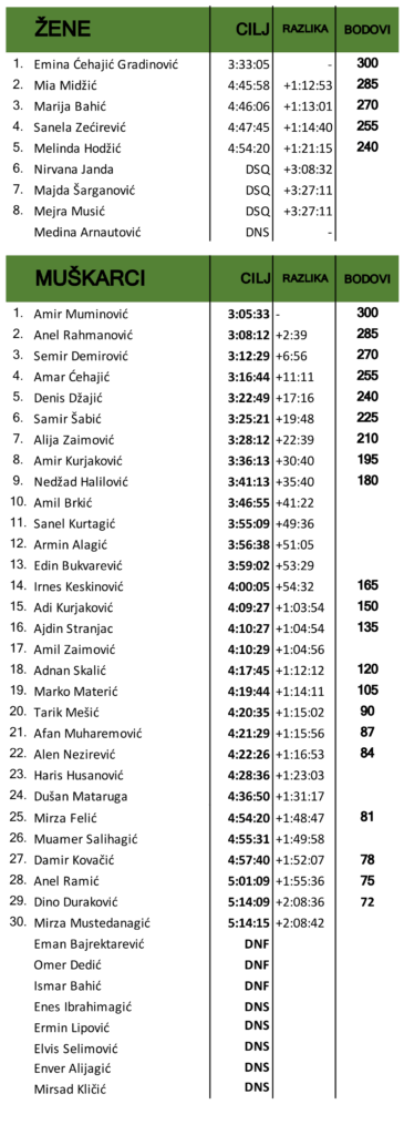 Najbrže u ženskoj konkurenciji bile su Emina Ćehajić Gradinović sa vremenom 3 sata 33 minuta i 5 sekundi, Mia Midžić sa vremenom 4:45:58, te Marija Bahić sa vremenom 4:46:06.